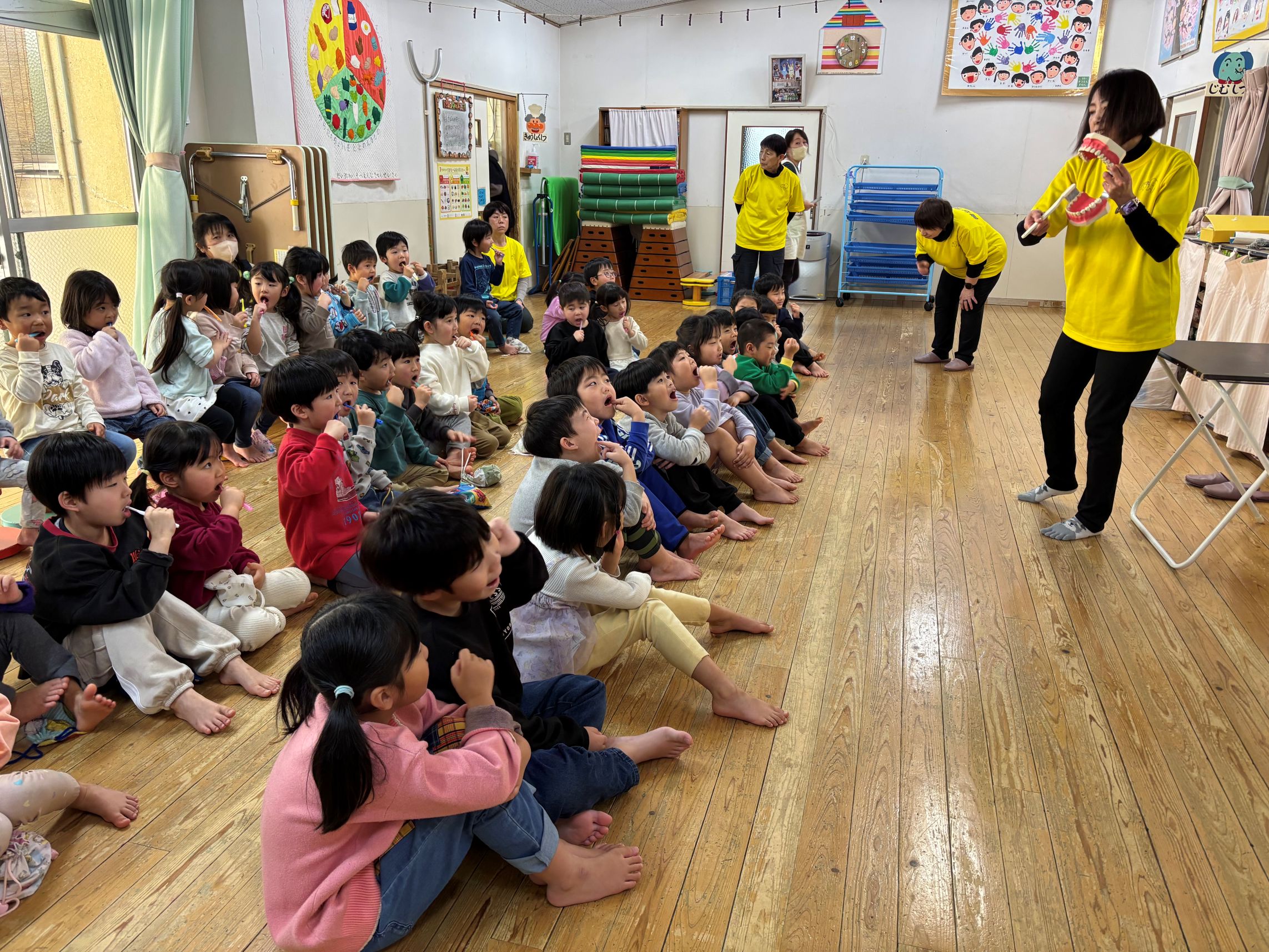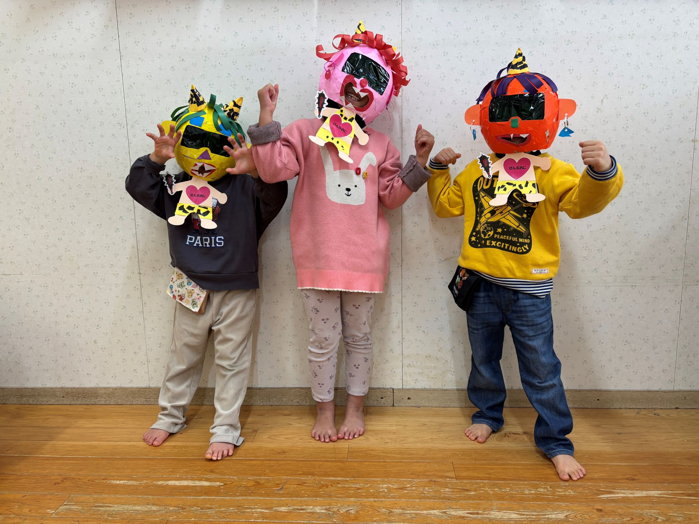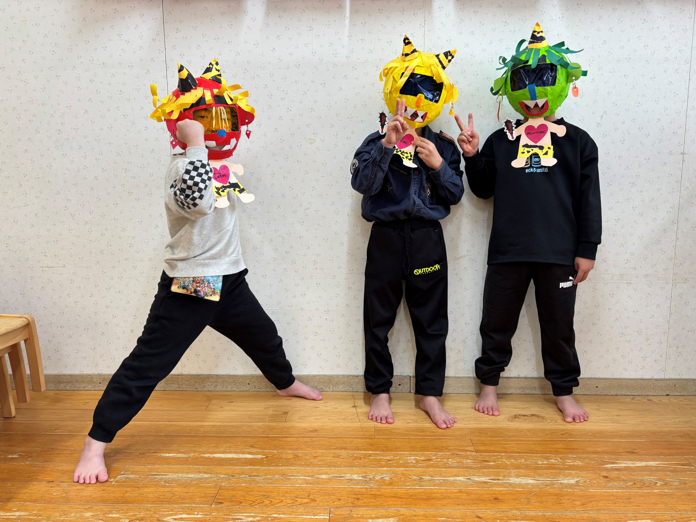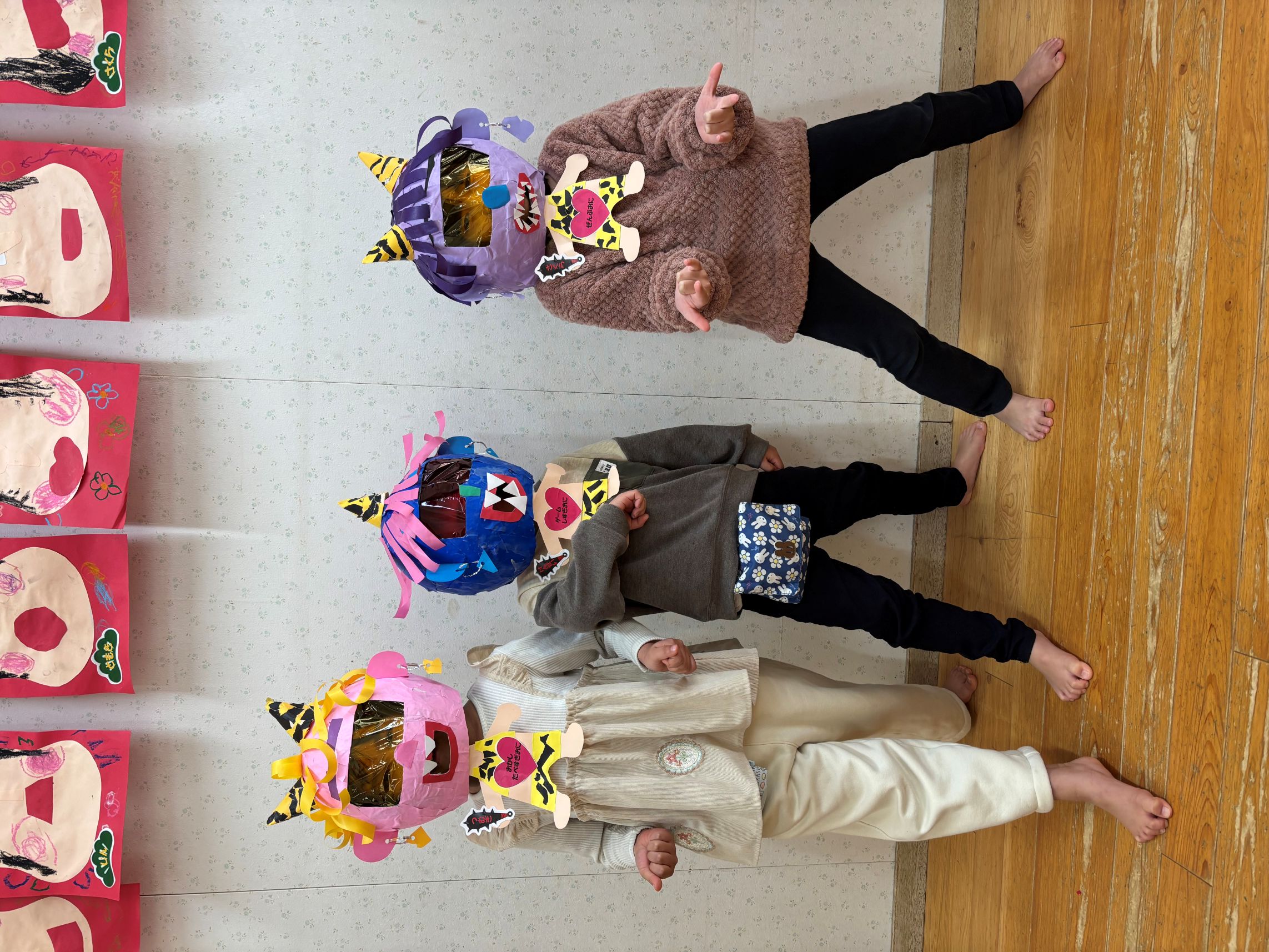 2月は節分があり、風船に新聞紙や折り紙を頑張ってぺたぺた貼って、ヘルメットの鬼が出来上がり大満足の子どもたち!!みんなワクワク♡ドキドキ♡心の中の鬼を追い払うことができました(^_-)-☆又、はなまる元気グループの方が来られて、歯のお話を集中して聞く事ができました(^^)/今月からお勉強が始まり、あくびをしながらひらがなを一生懸命書いて頑張っています!!