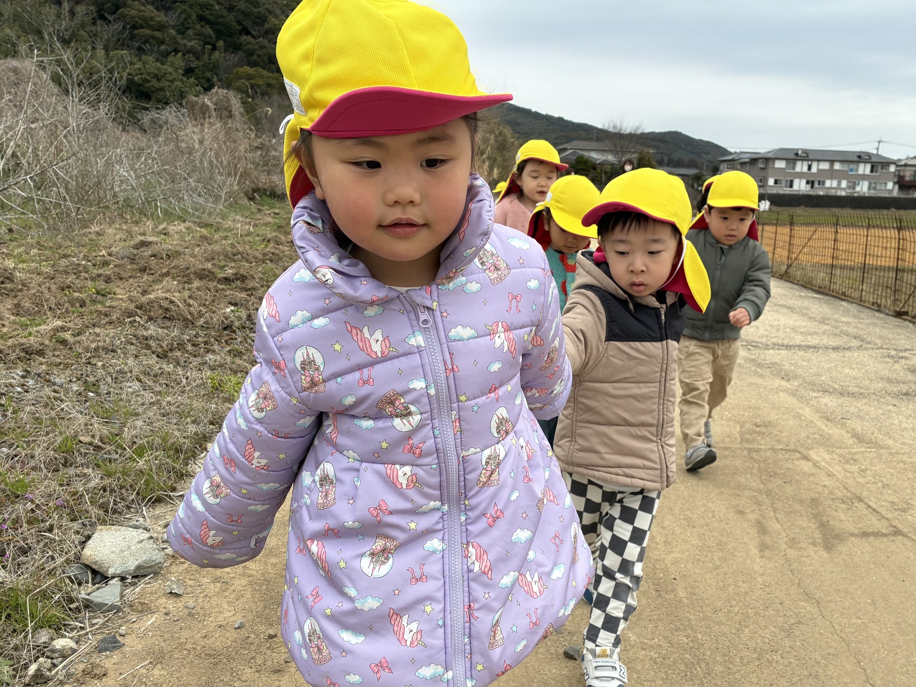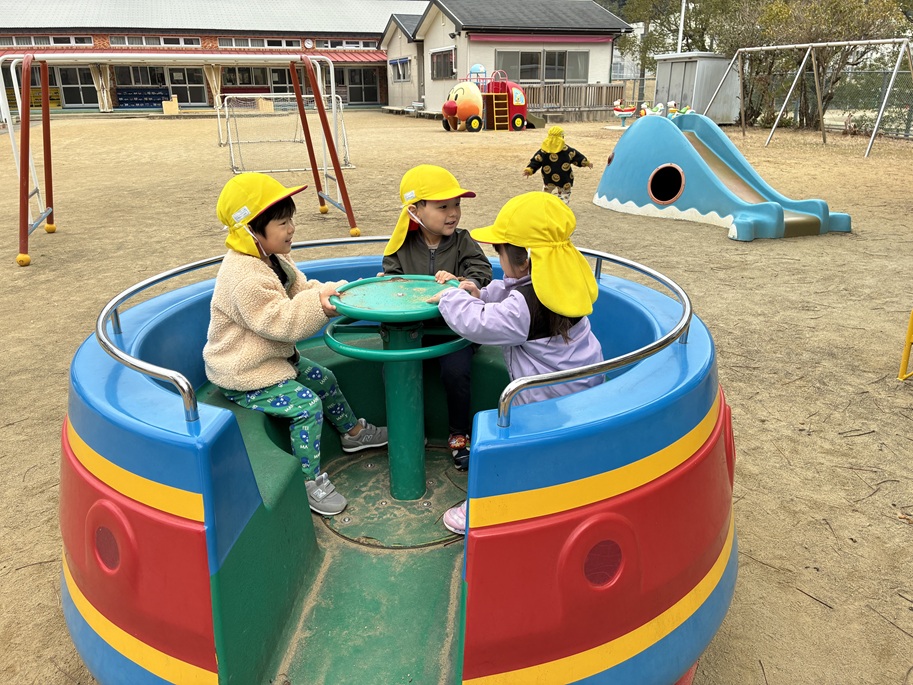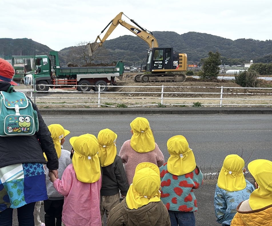 2月のそらぐみは、寒さに負けず戸外活動をしました。みんなで仲良く回転式遊具で遊んだり、お散歩では工事現場の見学をしてショベルカーの動きに興味津々でした。進級に向けてお箸を使って食事をしています。
