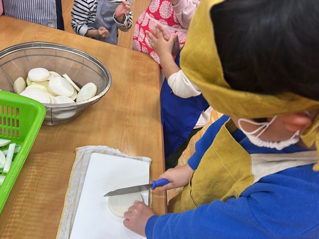 あおぐみさんでは大きな大根んを使って切り干し大根を作りました。包丁で大根を切る作業ではドキドキした様子の子どもでしたが上手くできて大喜びの様子でした(^▽^)あっという間にシワシワに小さくなった大根を水で戻してサラダにして美味しく食べました☆